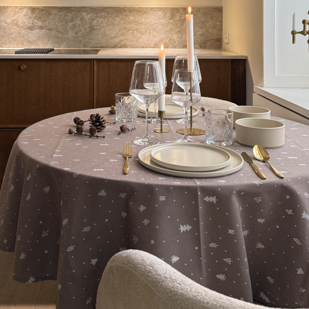 Den store runde form gør dugen oplagt til det store spisebord, hvor mange samles i december. Ø200 cm giver et smukt fald og understøtter den rolige, nordiske julestemning.