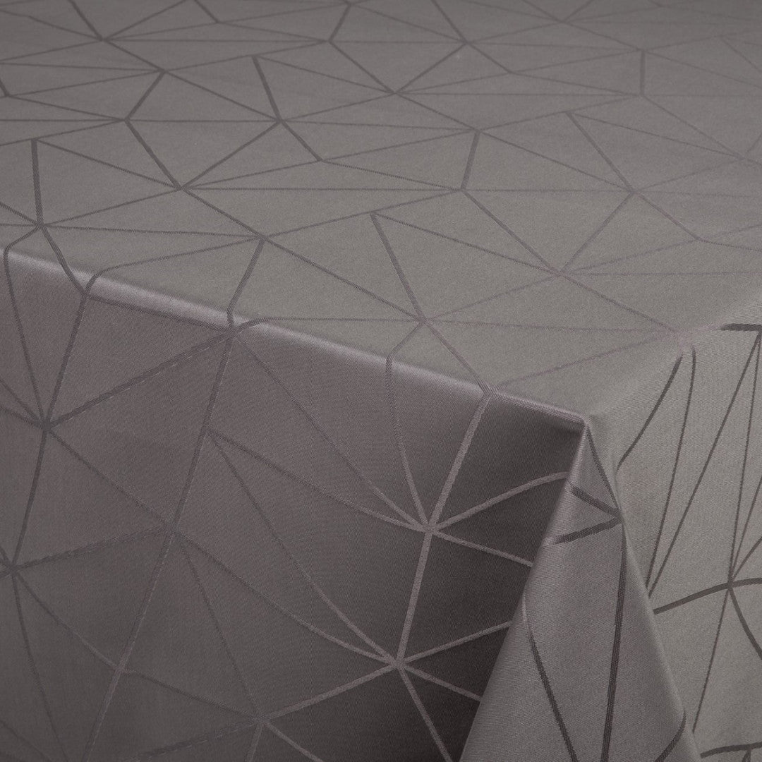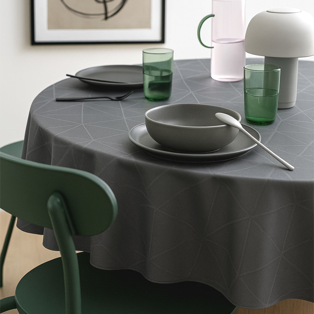 Engholm Tilde rund damaskdug i grå har et moderne geometrisk mønster, der giver bordet et elegant og roligt udtryk. Den afdæmpede grå farve fremhæver damaskvævningen og gør dugen let at kombinere med både klassisk og moderne service.