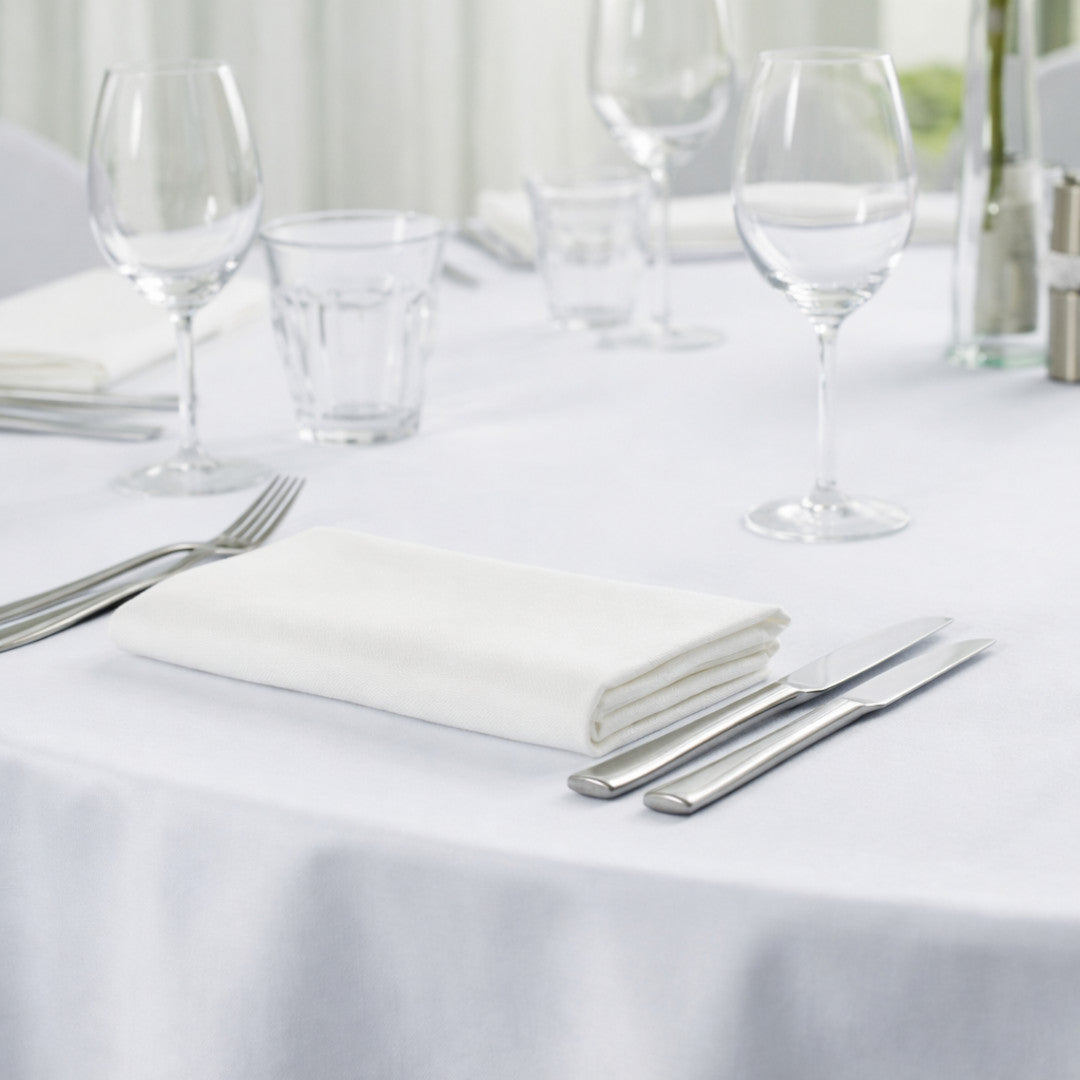 Gastro Hvid er en rund dug i damaskvævet polyester, udviklet til høj belastning og gentagen brug. Det enkle hvide design giver et tidløst udtryk, der passer til både private fester og mere formelle arrangementer.
