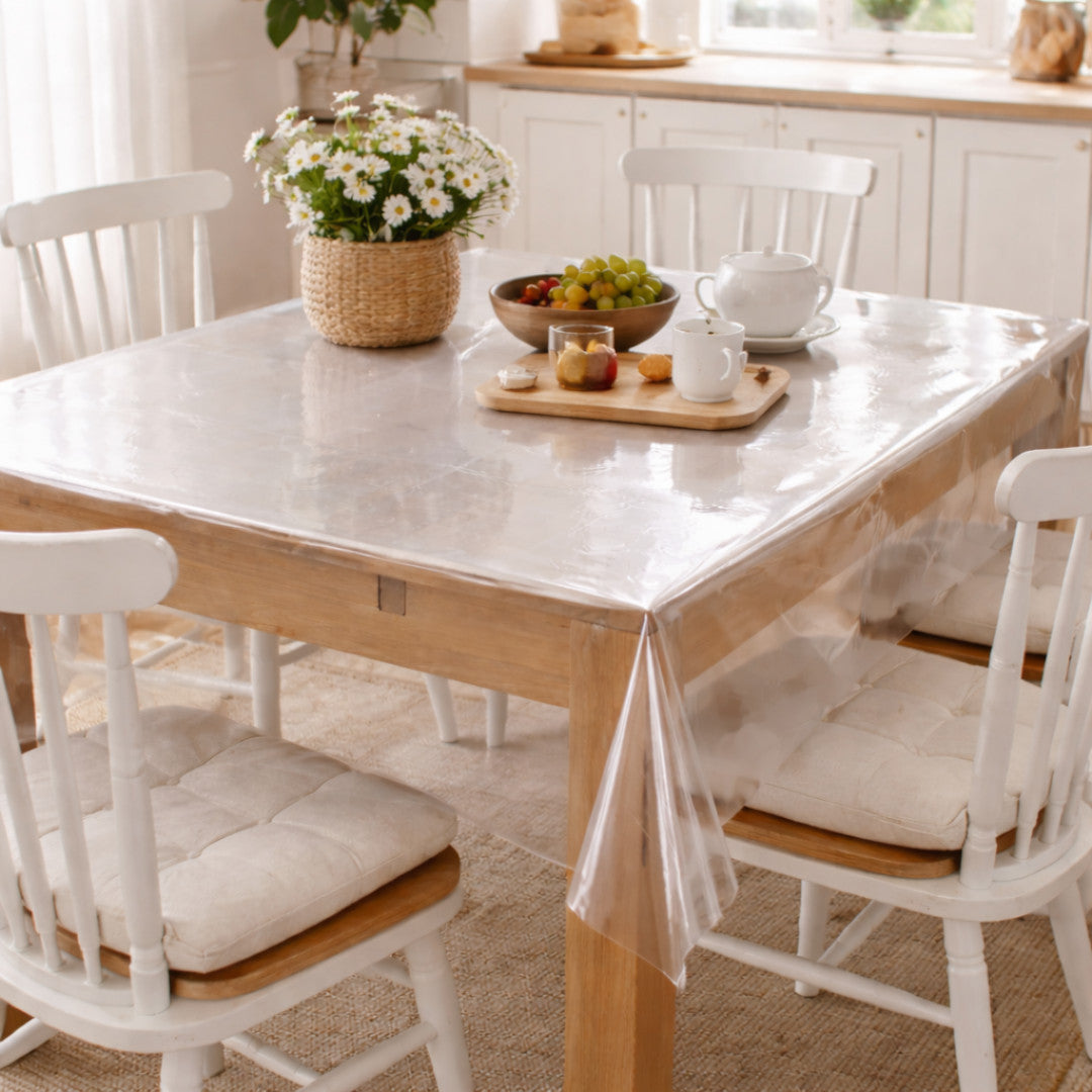Den klare overflade gør det muligt at bevare bordets udseende, samtidig med at det beskyttes mod spild og daglig brug. Dugen kan også anvendes oven på en stofdug for ekstra beskyttelse, uden at borddækningen ændrer karakter.