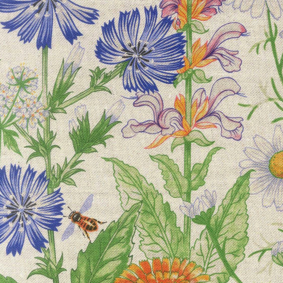 Grøftekant i Flor er en levende og stemningsfuld tekstilvoksdug, inspireret af den frodige natur langs blomstrende grøftekanter. Farverige markblomster i blå, orange, hvid og rosa toner breder sig langs dugens kanter og skaber et naturligt og sommerligt udtryk.