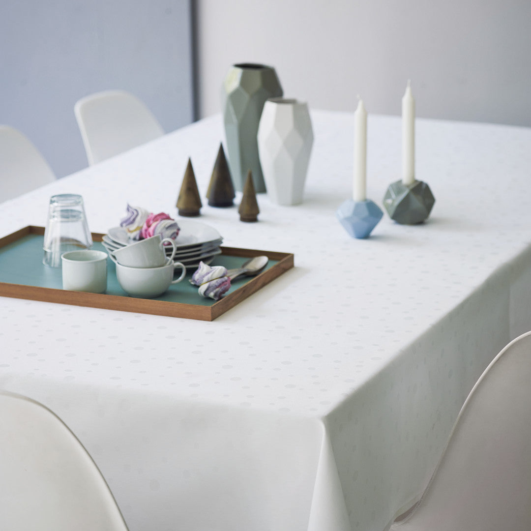 Juna Dot Hvid er en klassisk damaskdug i en klar, hvid farve, der giver borddækningen et let og velafbalanceret udtryk. Det diskrete prikkede mønster er vævet ind i stoffet og tilfører dugen liv og struktur uden at tage opmærksomheden fra service og opdækning.