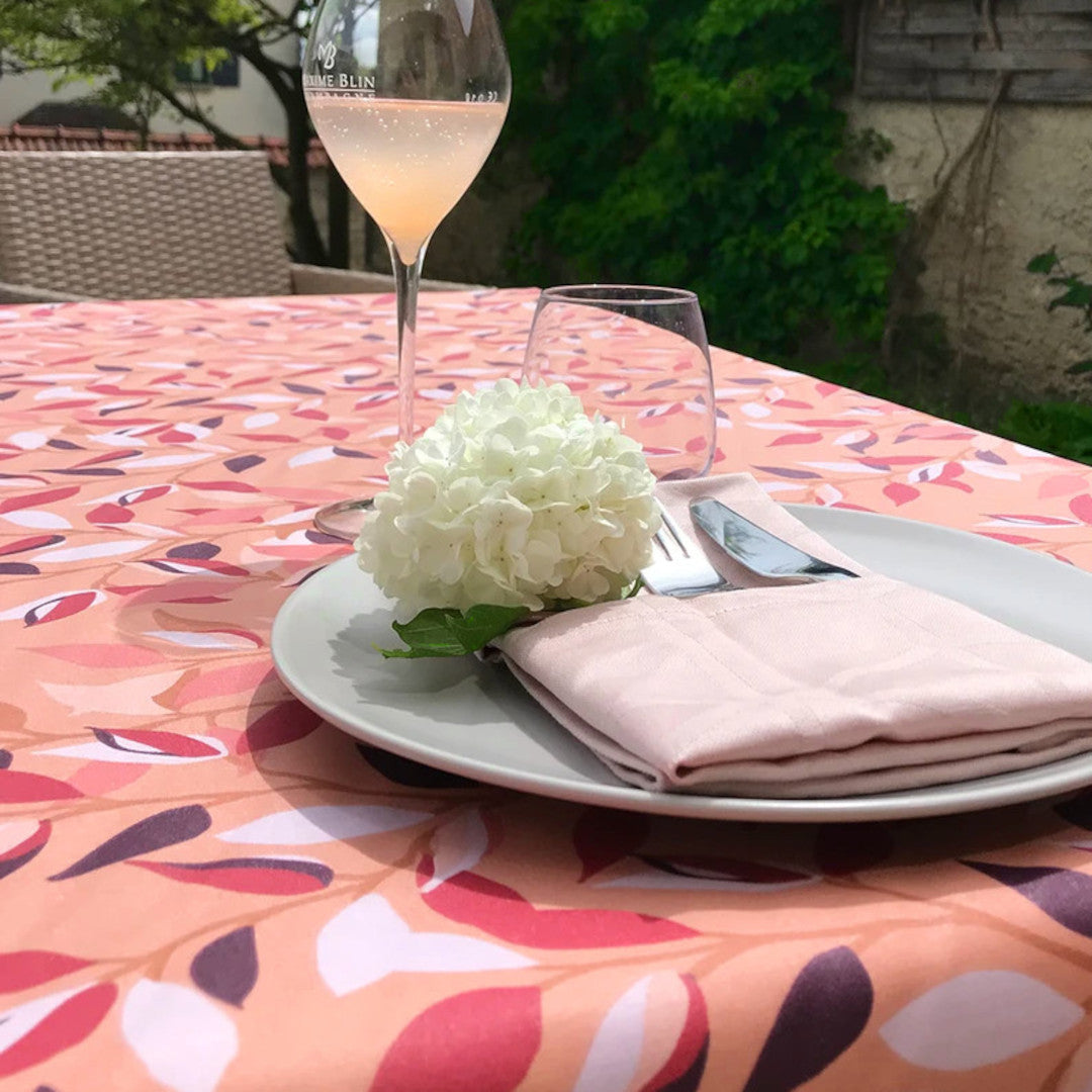 Farvesammensætningen er inspireret af sensommer og efterår, men dugen fungerer smukt hele året – både inde og ude. Det organiske mønster giver borddækningen liv uden at dominere og er let at kombinere med både keramik, glas og tekstiler i neutrale eller varme toner.