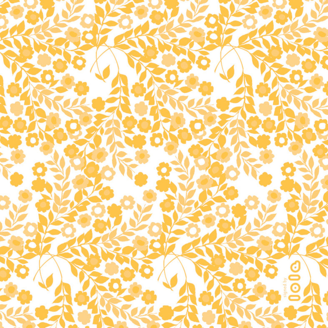 Lola Wallflower Saffron Summer Bloom er en lys og stemningsfuld voksdug med et tæt blomster- og bladmønster i varme safrongule nuancer på en blød, råhvid bund. Farverne ligger tæt tone i tone og skaber et levende, men stadig harmonisk udtryk, der emmer af sol og sommer.