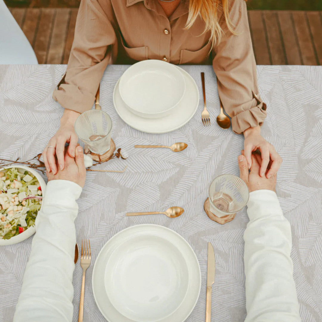 Tekstilvoksdug i en varm sandfarvet nuance med et let og afdæmpet bladmønster i lyse toner. Det bløde, næsten håndtegnede udtryk skaber en rolig og naturlig stemning omkring bordet og giver dugen et elegant, men underspillet præg.