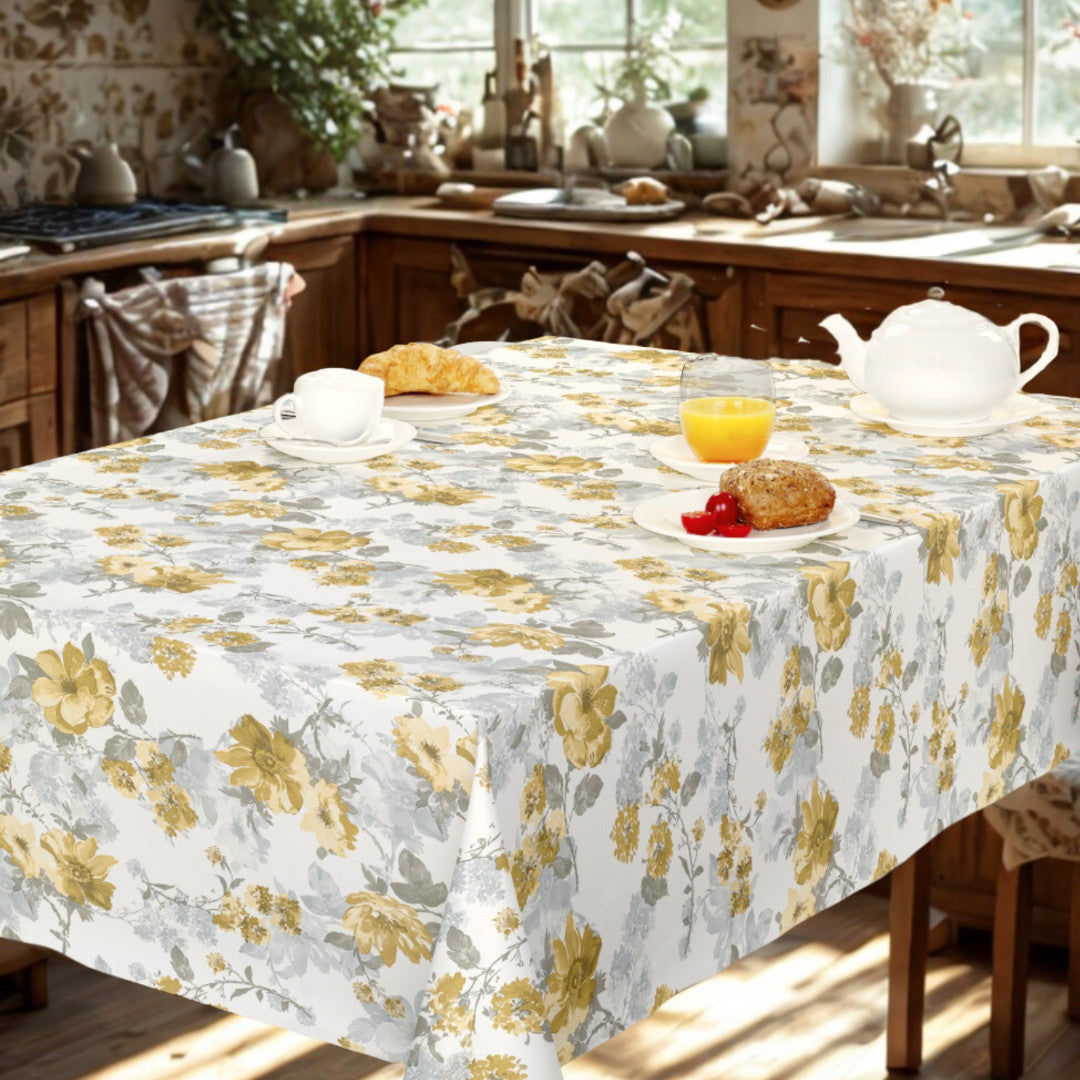 Nordfavn Elisabeth Gul er en romantisk voksdug med et blødt blomsterprint i varme gule nuancer kombineret med støvede grå toner på en lys bund. De lette, akvarel-inspirerede blomster og fine grene skaber et luftigt og indbydende udtryk, der tilfører borddækningen varme og elegance.