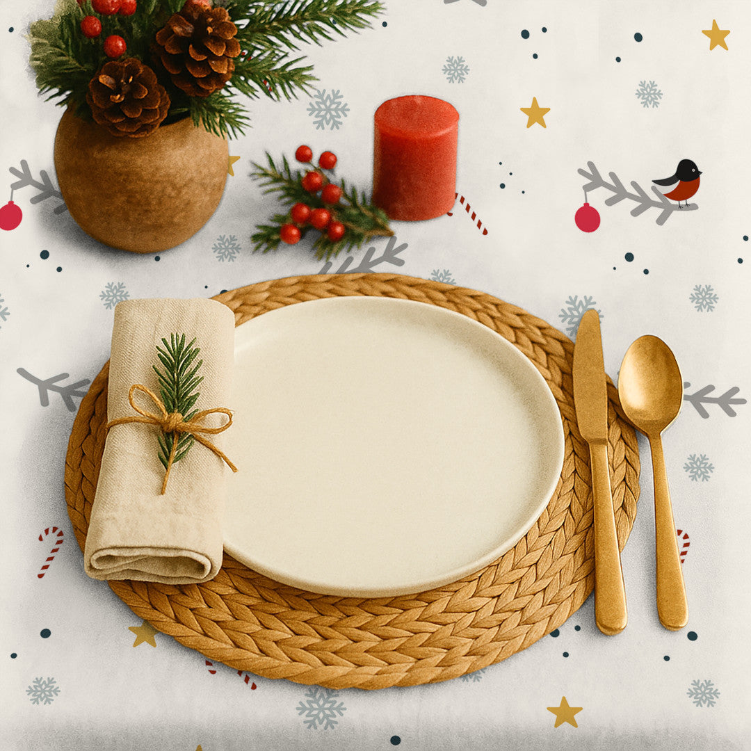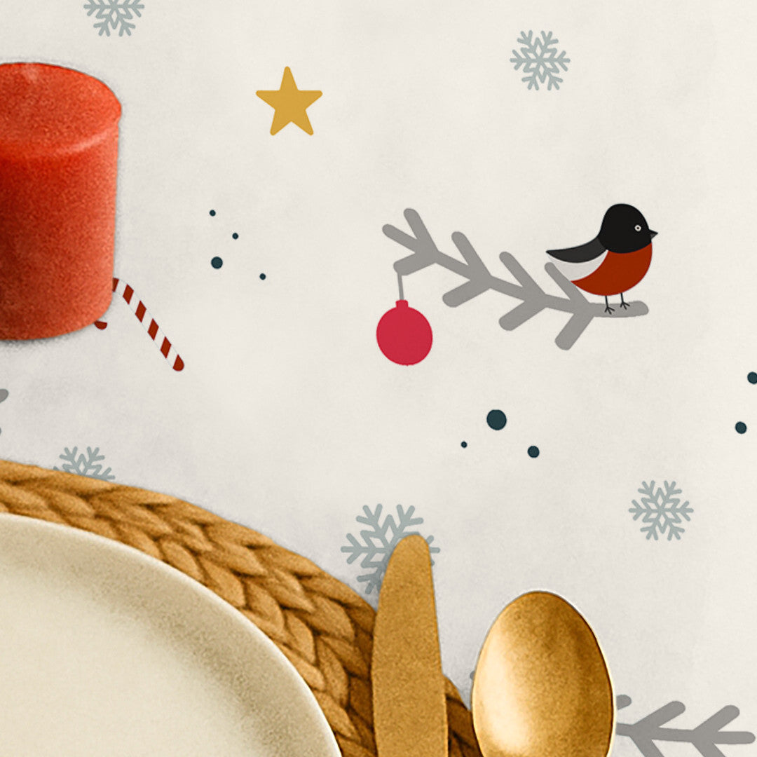 Juletekstilvoksdug med et let og poetisk motiv af små fugle og fine grene, placeret på en lys bund med bløde, afdæmpede farver. Det luftige design skaber et roligt og elegant udtryk, mens diskrete detaljer tilfører varme og julestemning uden at dominere.