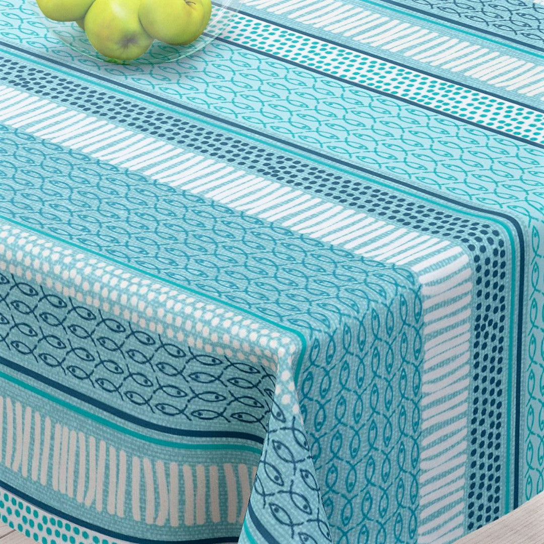 Stilren tekstilvoksdug med et maritimt inspireret mønster i blå og lyse nuancer. De grafiske striber og diskrete detaljer skaber et roligt og harmonisk udtryk ved bordet.