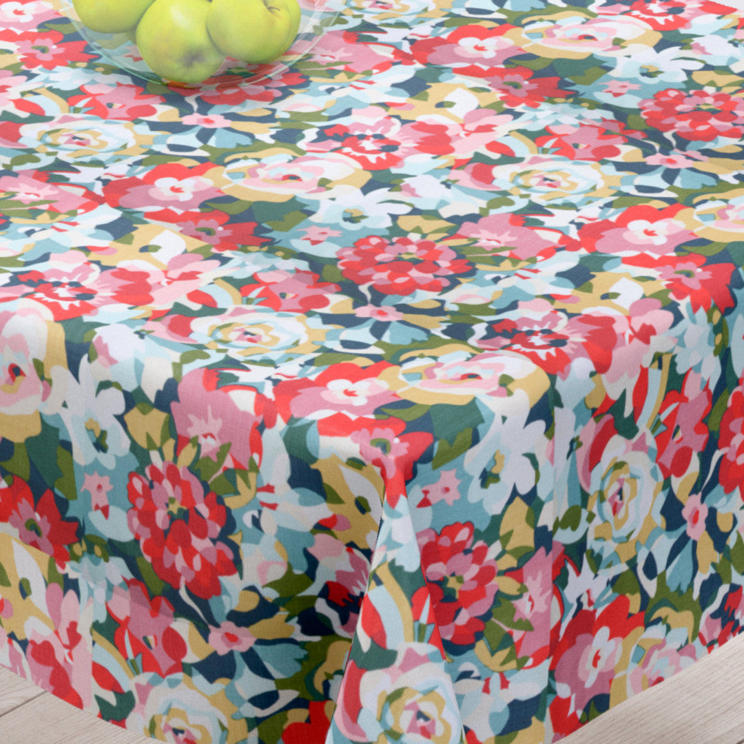 Farverne er nøje sammensat, så dugen fremstår både frisk og afbalanceret. De bløde overgange mellem blomster og blade giver et moderne, næsten malerisk udtryk, som passer perfekt ind i både det nordiske køkken og det farverige sommerbord.