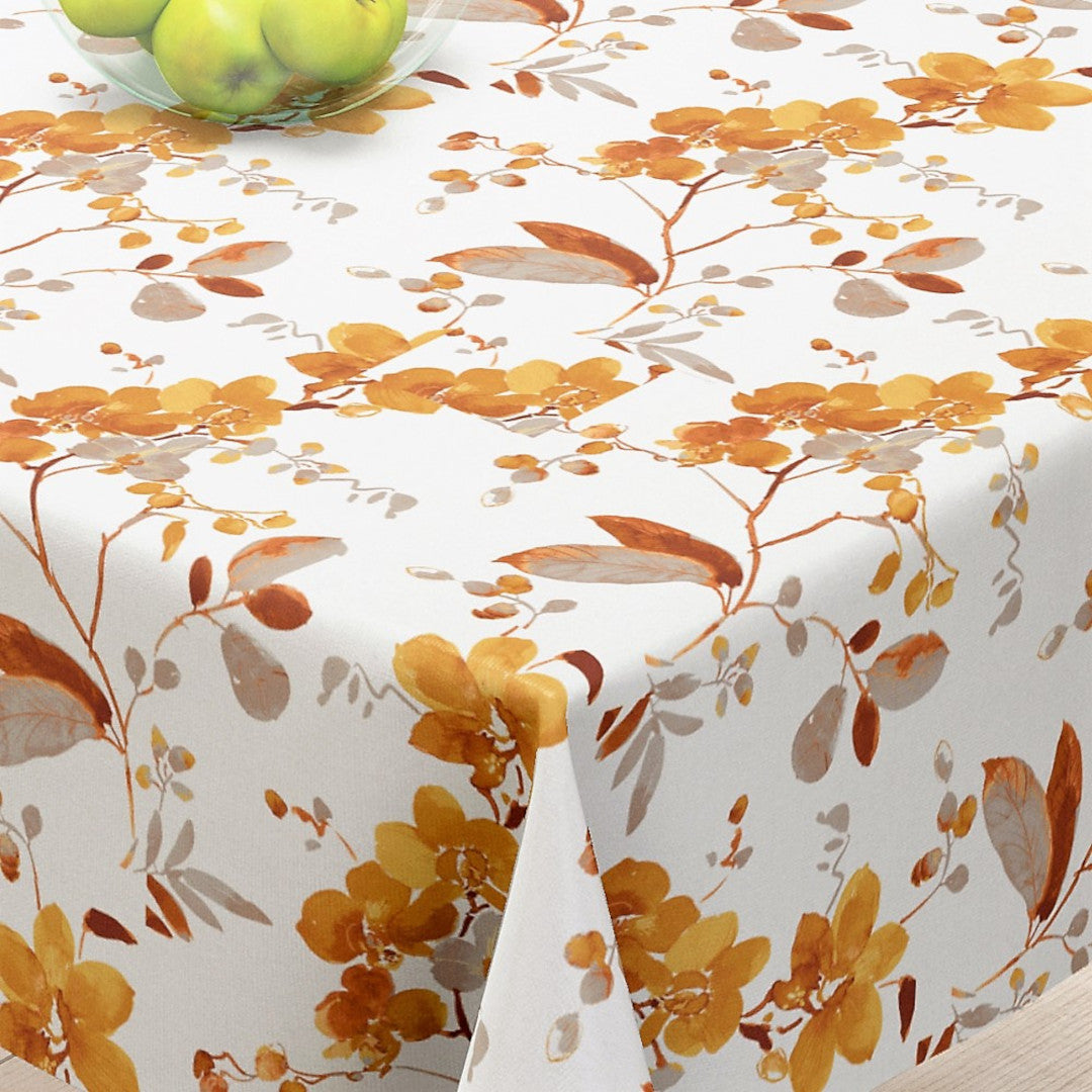 Virkelig smuk hørdug i 100 % hør, dekoreret med de fineste orkideer, blade og grene i varme, brændte nuancer af sennep, okker og bløde naturtoner.