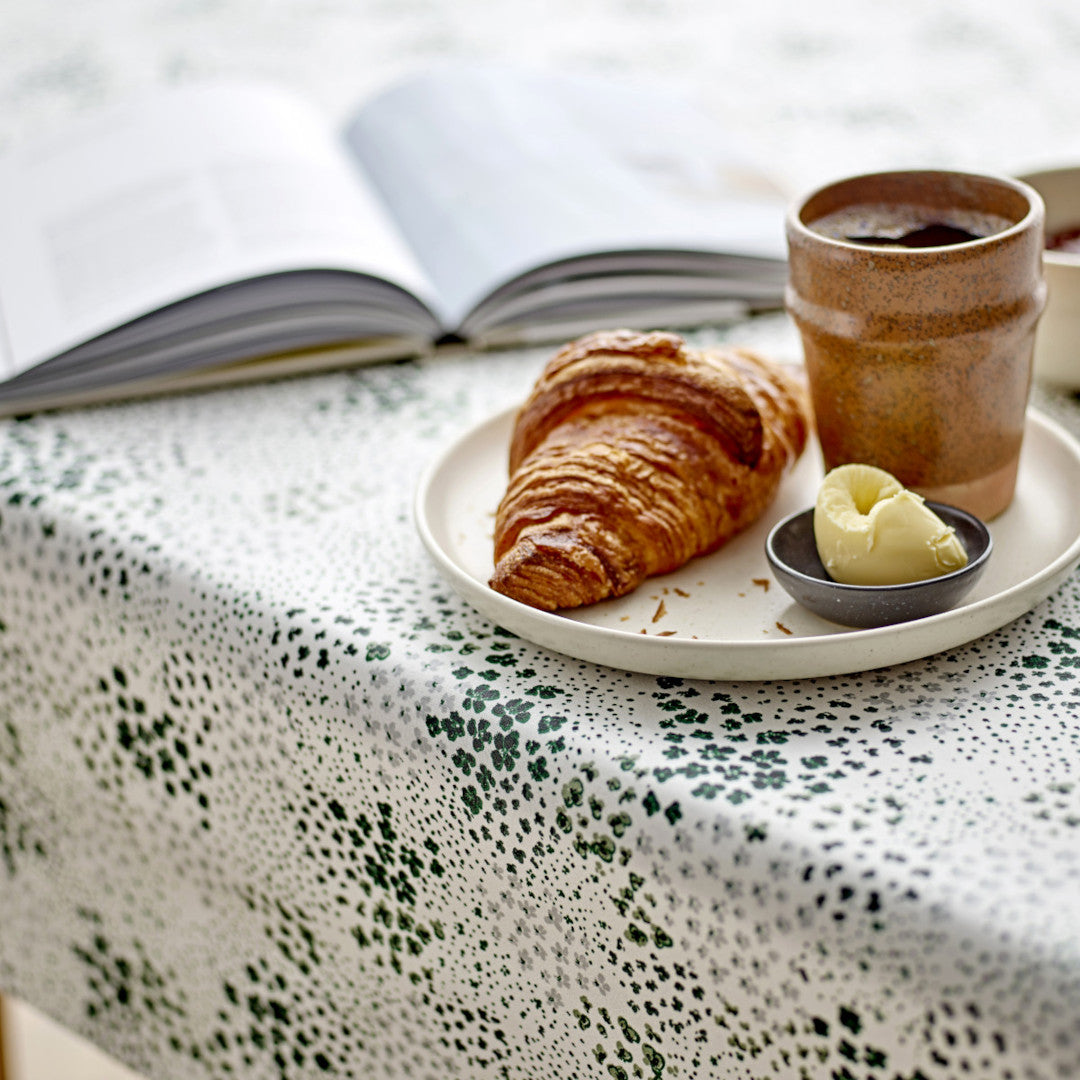 Den tekstile overflade i 100 % bomuld giver dugen en blød og indbydende fornemmelse, mens den skridsikre bagside hjælper med at holde dugen stabilt og pænt på plads. Viola Green er et stilrent valg til dig, der ønsker en tekstilvoksdug med et let, naturligt og eksklusivt udtryk.